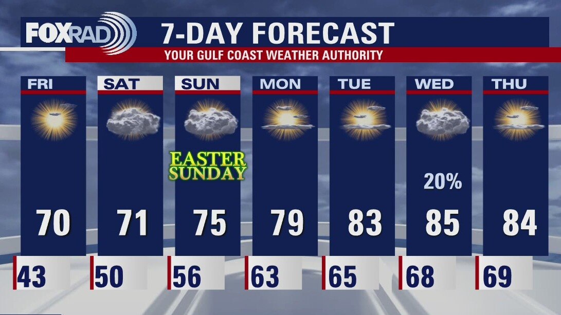 Friday will start off rather cool with lows mainly in the 40s. The afternoon looks nice with highs reaching the 70s. Easter Weekend looks alright. It will be more cloudy and a stray drop of rain is not out of the question, but isn't likely. The coming week looks a little warmer with high temps heading back into the 80s.