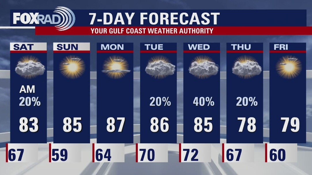 The risk for showers will drop quickly on Saturday and the skies will be clearing by the afternoon. Sunday will be a warm day with highs reaching the middle 80s. The week starts off nice with the next chance for rain coming on Wednesday.
