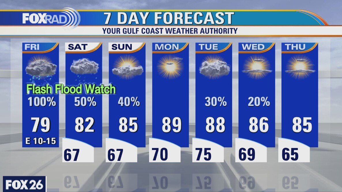 A Flash Flood Watch has been issued for the entire Houston-area until 7AM Sunday. Rain, heavy at times, is likely this morning into the afternoon. We should see the rain taper off some as we head toward evening, but it's possible some areas might see more heavy rain on Saturday. Rainfall totals could exceed 6" before the rain wraps up on Sunday, however most of us will likely see between 2 and 4 inches. Temperatures will remain mild in the mid and upper 70s to near 80 degrees. The really warm weather returns Monday with highs expected to near 90 degrees.