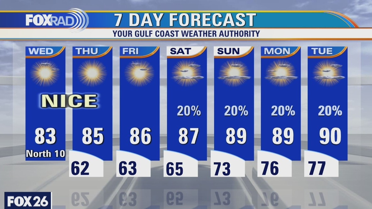 Clear and cooler this morning, then sunny and dry with highs in the low to mid 80s.