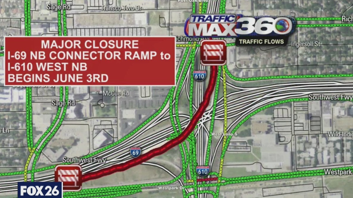 On June 3 at 9 p.m., crews will close the I-69 Southwest Freeway northbound connector ramp to I-610 West Loop northbound.