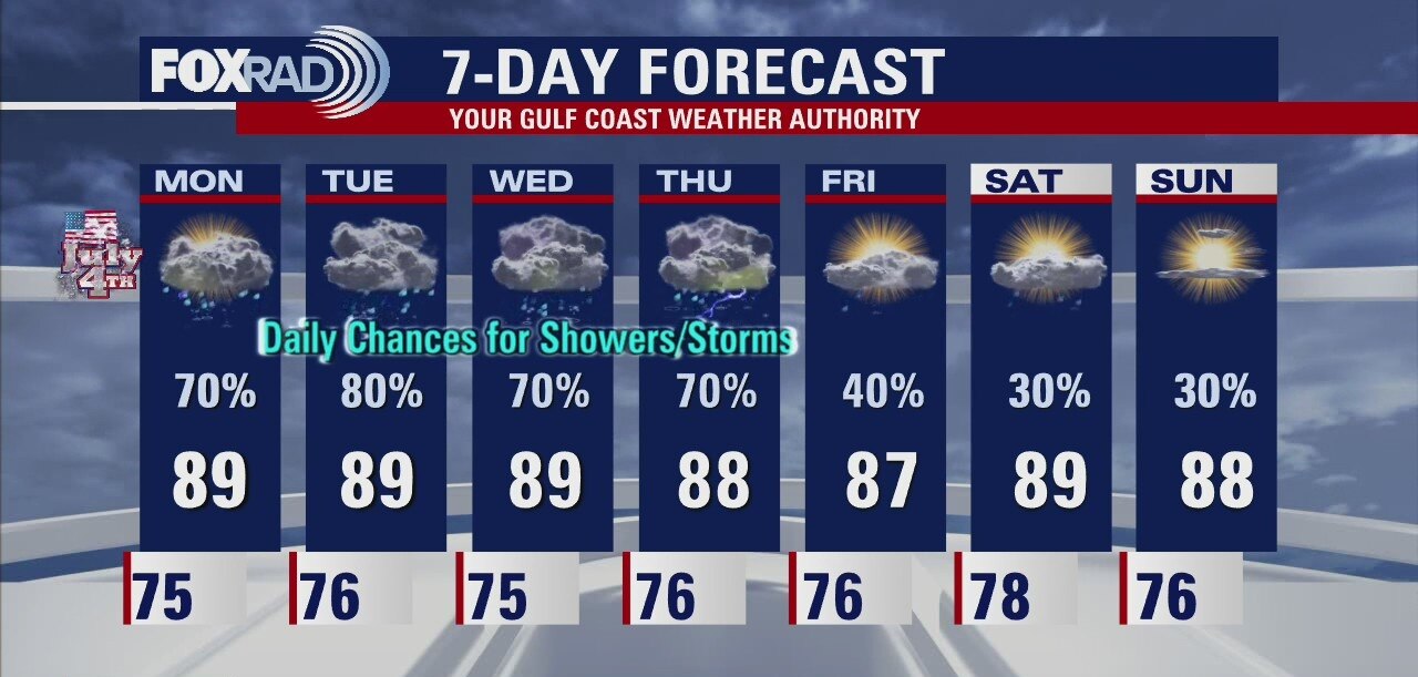 Meteorologist Collin Myers says showers and storms should dwindle before late this evening making for better fireworks. Plenty of scattered shower and storm chances lingering into this week, including some heavier rainfall on some days.