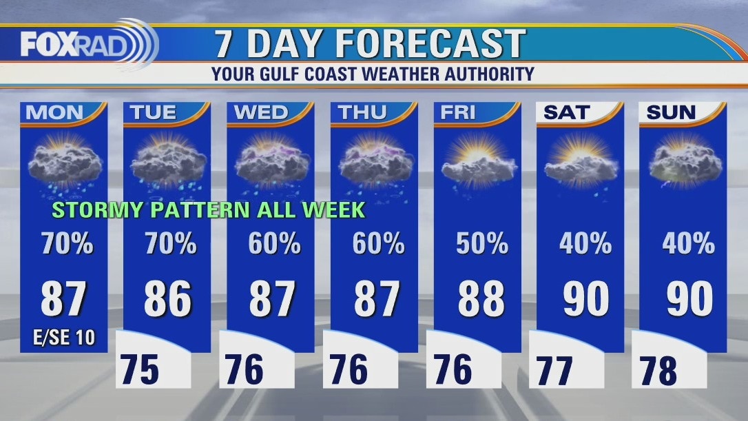 Warm and humid with afternoon storms likely. Highs in the upper 80s.