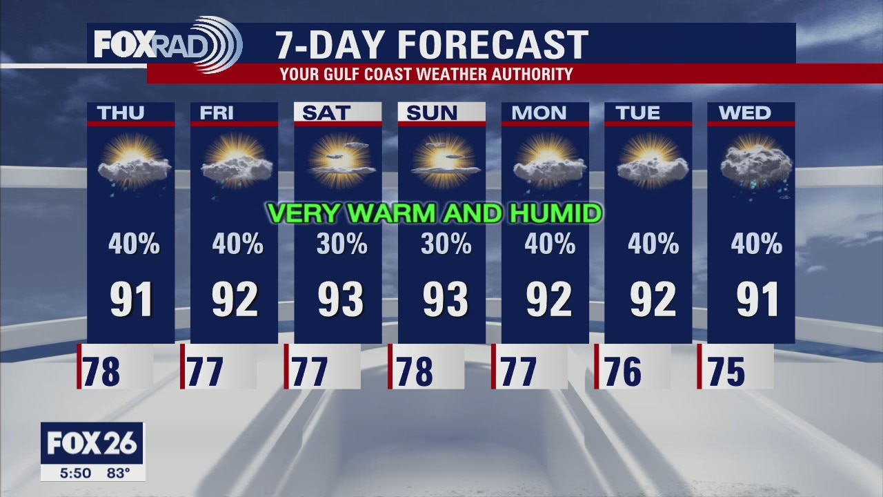 The weather pattern for SE Texas and the Houston area remains steady with warm temps, lots of humidity and daily chances for mainly afternoon showers and storms. It looks like this at least through the weekend and into the coming week.