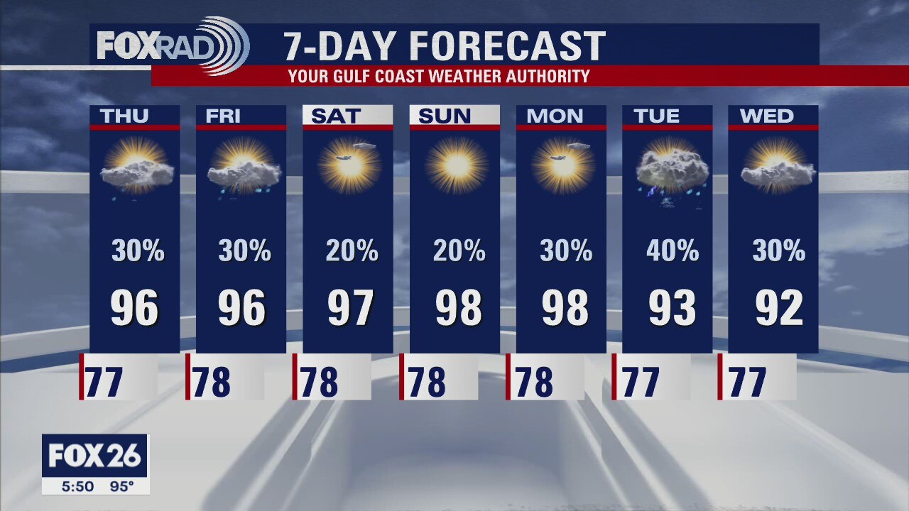 The July heat is here and you should expect it to stay around for a while. There will be a few afternoon showers but don't look for much of break from the heat index values running 105-110. Most of us won't get any rainfall, it's looking like a very typical summer pattern. Maybe a few more showers around the area on Tuesday.
