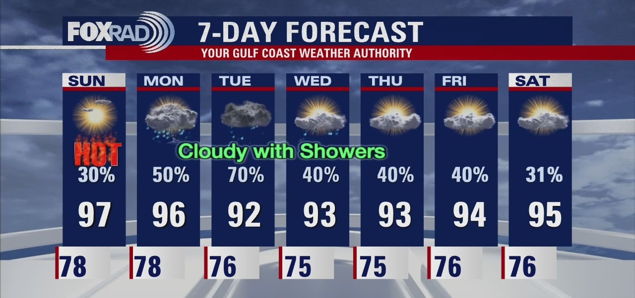 A hot summertime pattern continues for the second half of the weekend. Look for isolated afternoon showers/storms Sunday with feels like temperatures around 105. A stalling front on Monday will bringing a change to things here in Houston with increased clouds and rain chances for most of the week.