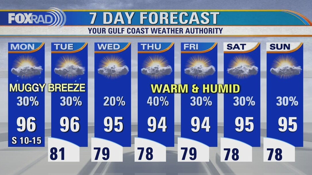 Not much day to day variability is expected this week. Highs each day should reach the mid 90s with lows close to 80 and a daily round of isolated storms. The heat index will hover near 105 in the mid afternoons. We're watching a couple of tropical waves moving toward the Caribbean this week, but there's no immediate threat.