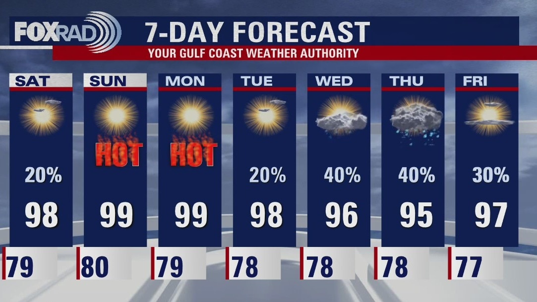 Rain chances will be dropping a little each day for the rest of the week. Temps will get hotter and highs will reach the upper 90s and maybe low 100s by Monday. Hurricane Grace will stay in the southern Gulf with little impact on SE Texas.