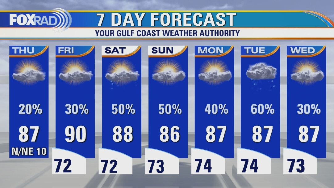 Partly cloudy and mild with isolated showers and highs in the mid to upper 80s.