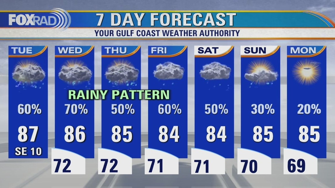 With the return of humidity and a big area of low pressure to our west, the next several days should bring several waves of rain with muggy conditions in between. Watch for off and on downpours today through at least Saturday with highs in the mid 80s and lows in the 70s.