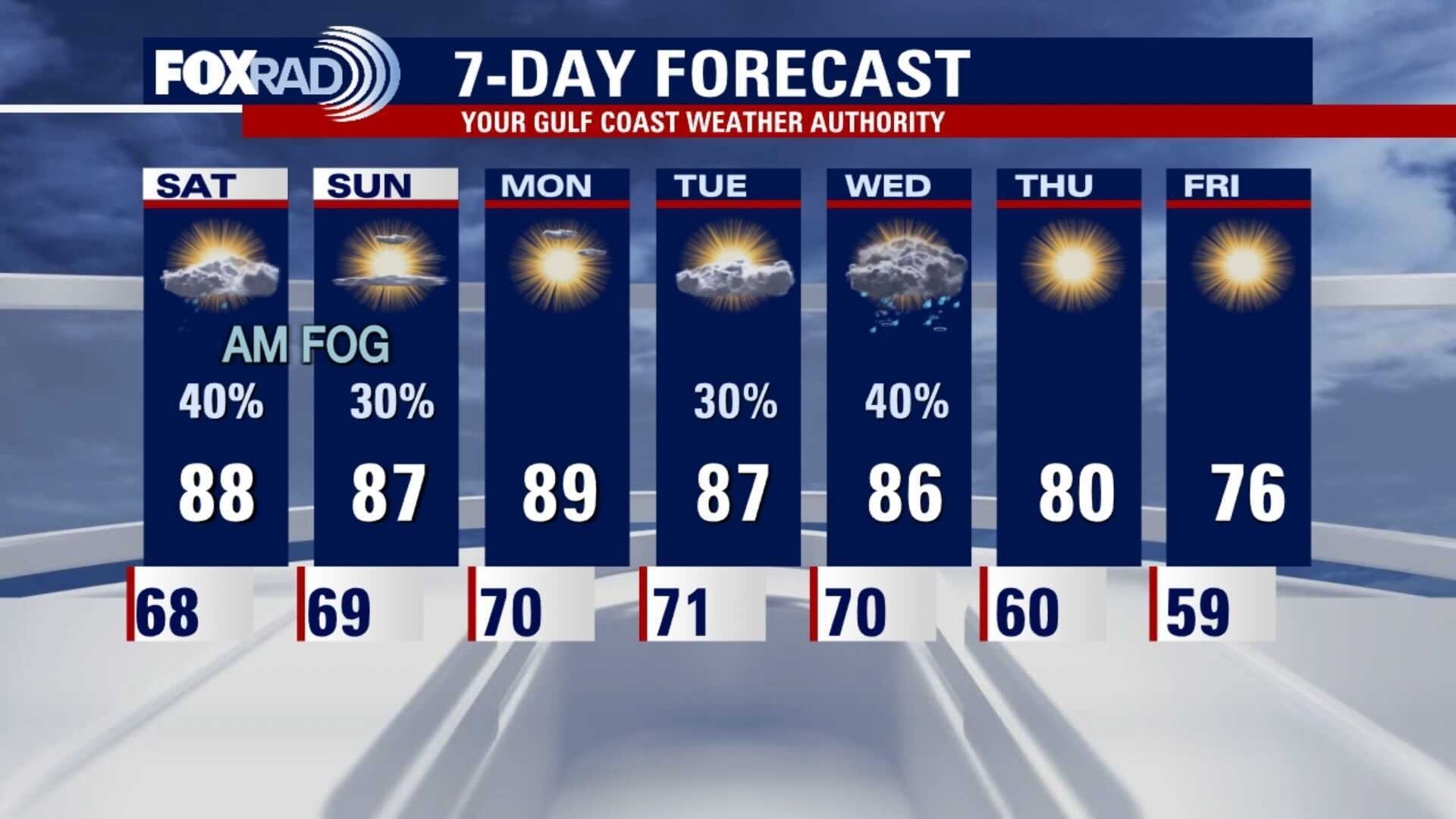 There will be some on-and-off showers over the weekend, but it should not be overly soggy. The better chance for rain will be along the coast. The next front will arrive on Wed. and that will lead to great weather later in the coming week.