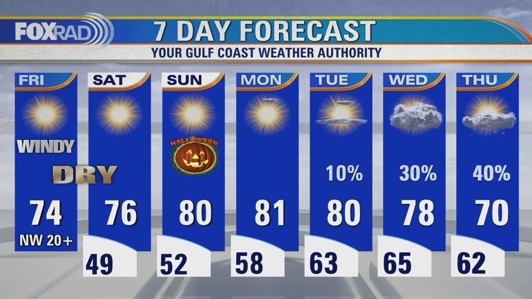 After two days of high winds, look for more breezy weather today, but not as extreme. Today is shaping up to be sunny, very dry and still a bit windy. The weekend and Halloween trick or treat forecast looks great with brisk mornings and sunny, dry days ahead. Moisture slowly returns next week.