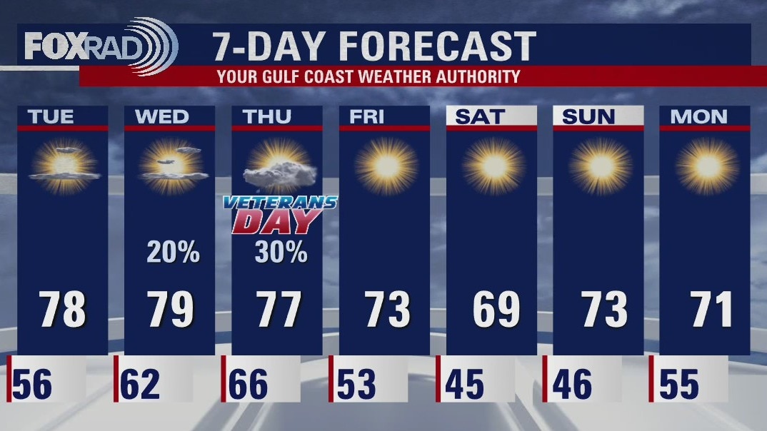 It will get a little warmer through the middle of the week and then a front arrives by late Wednesday and into early Thursday. There will be a brief chance for rain early on Veterans Day, but the rest of the week and weekend will be dry.