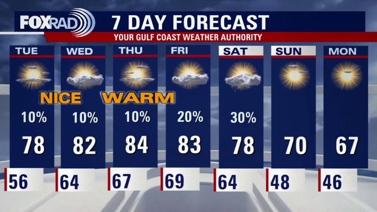 Rest of today will be very pleasant with temperatures in the low-mid 70s along with some high cirrus clouds and a return of a Gulf breeze. Overall, today looks great, but overnight tonight, some fog is possible along with a few sprinkles.