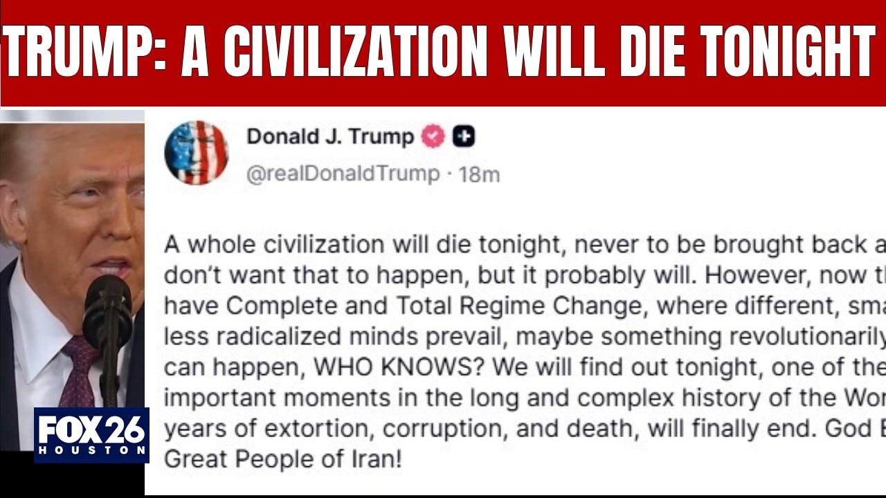 President Trump Tuesday morning posting, "A Whole Civilization Will Die Tonight." Iran reports three bridges have been destroyed Tuesday morning, hours before President Trump's ultimatum expires. The U.S. nor Israel claiming responsibility. Iran's president says he is willing to die defending Iran. The UN urging the U.S. not to strike civilian infrastructure, saying it violates international law.
