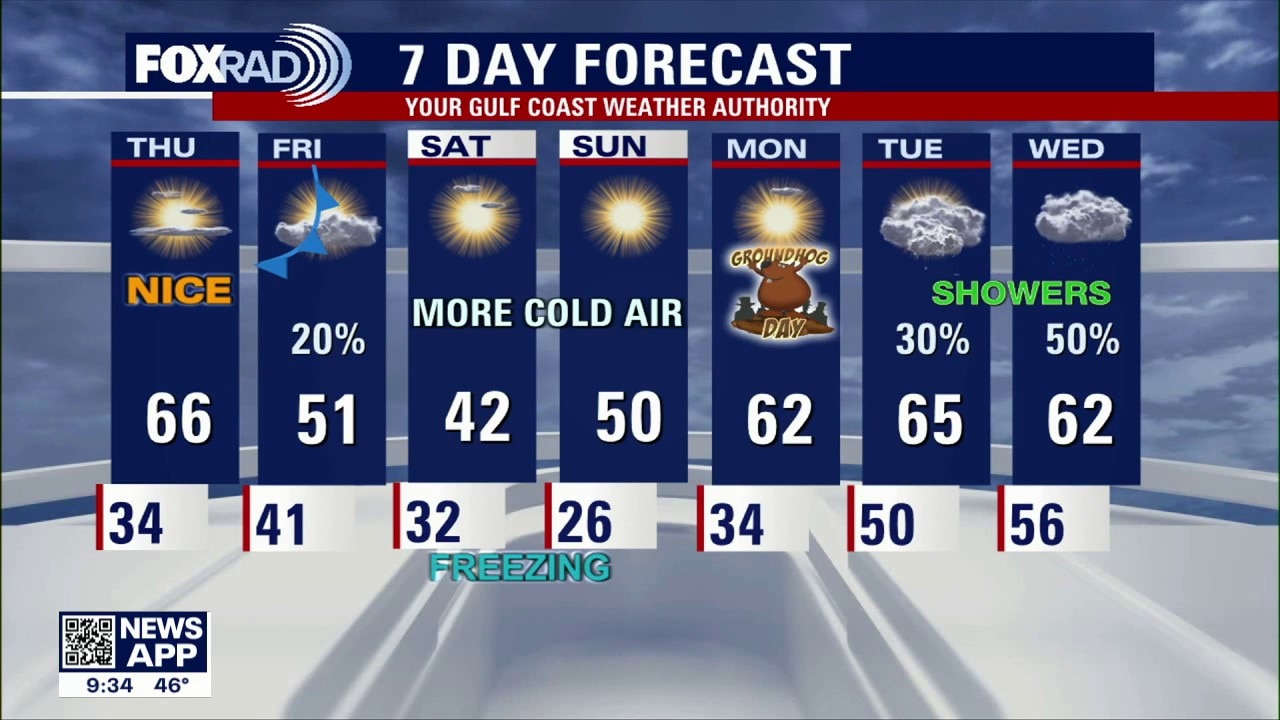 Afternoon temperatures climb into the middle and upper 60s Thursday, with overnight lows still cold but less extreme. Clouds may increase late Thursday ahead of the next system, signaling another pattern change.
