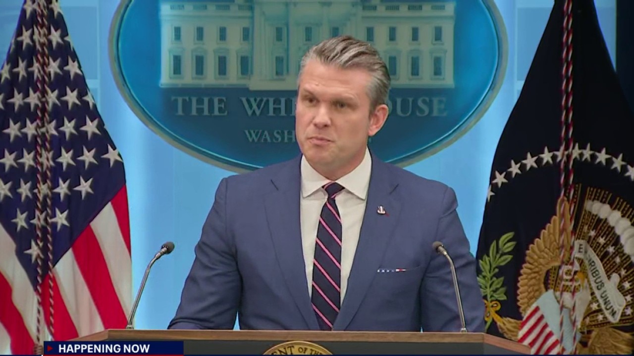 U.S. Secretary of War Pete Hegseth speaks during a press briefing about the war with Iran and the rescue of a downed U.S. airman from deep within Iranian territory.
