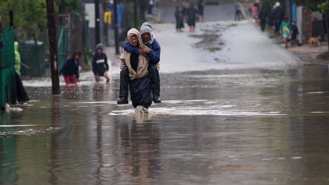 A man carries an elderly man across a flooded road during heavy flooding as a result of a storm in Sir Lowry's Village, close Somerset West on September 25, 2023. (Photo by RODGER BOSCH / AFP) (Photo by RODGER BOSCH/AFP via Getty Images)