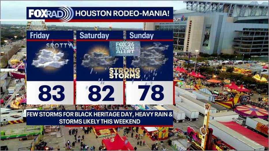 Those heading to the Houston Rodeo should prepare for wet conditions and potential severe storm development, including the risk of heavy rain and gusty winds, as the most active weather arrives late Saturday and lingers into Sunday.