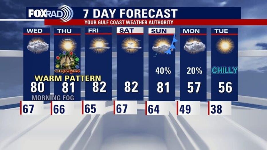 No significant fronts or widespread rain are expected to impact Christmas plans at this time, so the main issue to be morning fog and highs near 80.