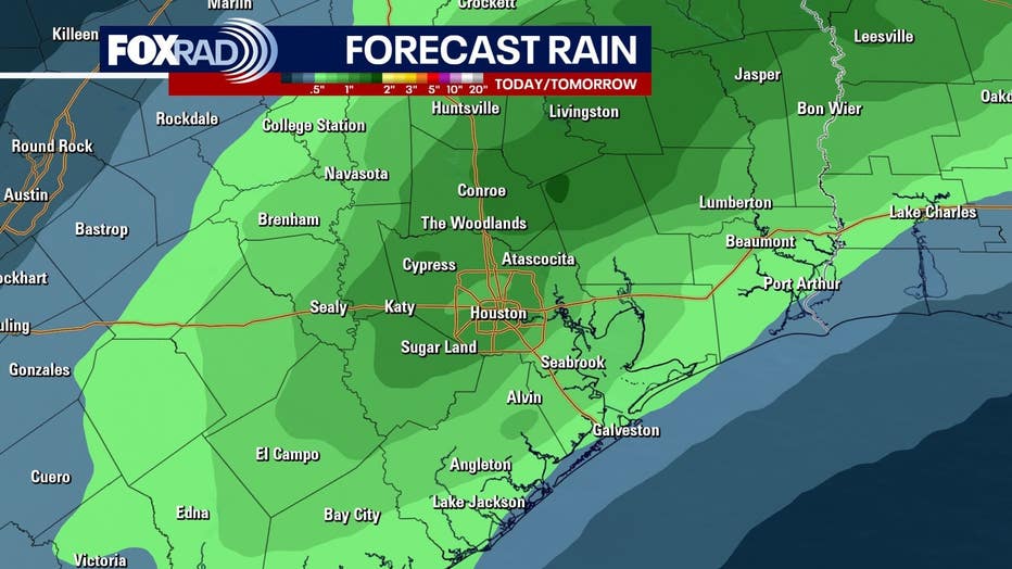 Southeast Texas could see about an inch of rain accumulation and limited areas could see 2-3" in total. The Weather Prediction Center has placed our entire viewing area in a 1/4 risk for street flooding. Always remember, turn around when you see a flooded roadway.