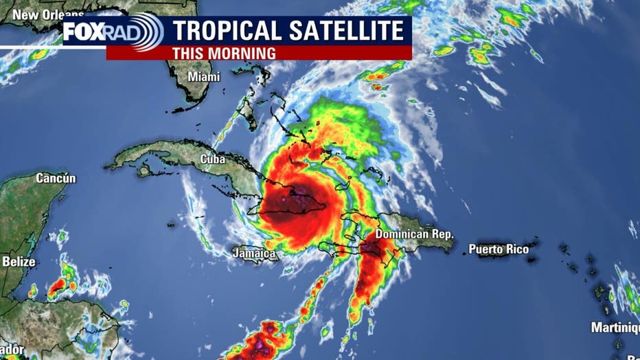 Hurricane Melissa, which made a historic, catastrophic landfall in Jamaica as a Category 5 storm, hit Cuba this morning as a major hurricane. The storm is moving northeast and will continue across the southeastern Bahamas before approaching Bermuda later this week. No direct impacts expected for the U.S. mainland.