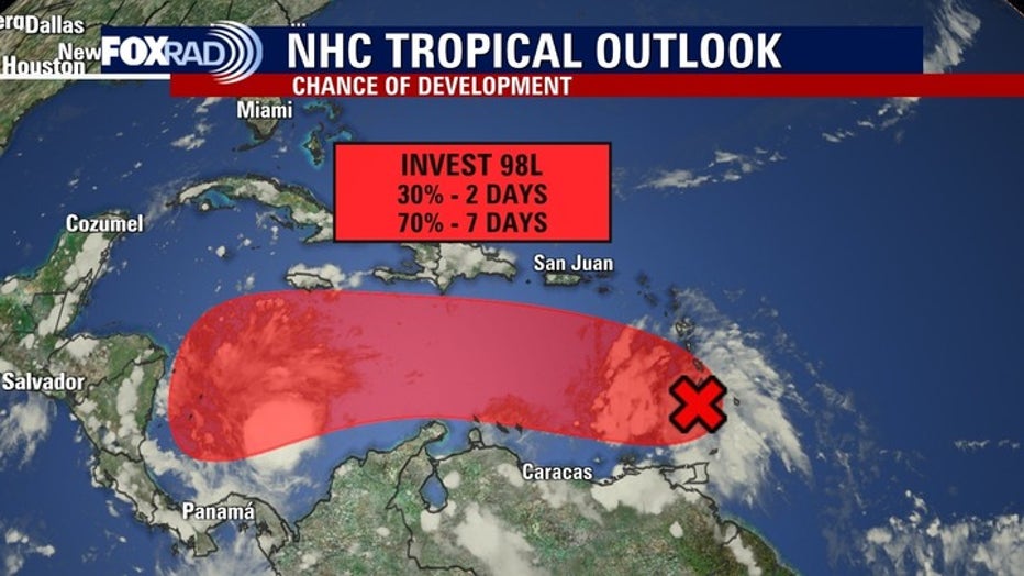The National Hurricane Center is still monitoring a tropical wave moving into the Caribbean. This tropical wave has been labeled Invest 98L and is expected to continue moving west until it slows down in the middle of the week. Conditions are favorable for it to become the next named storm over the next 7 days.