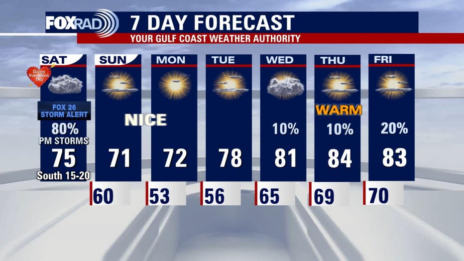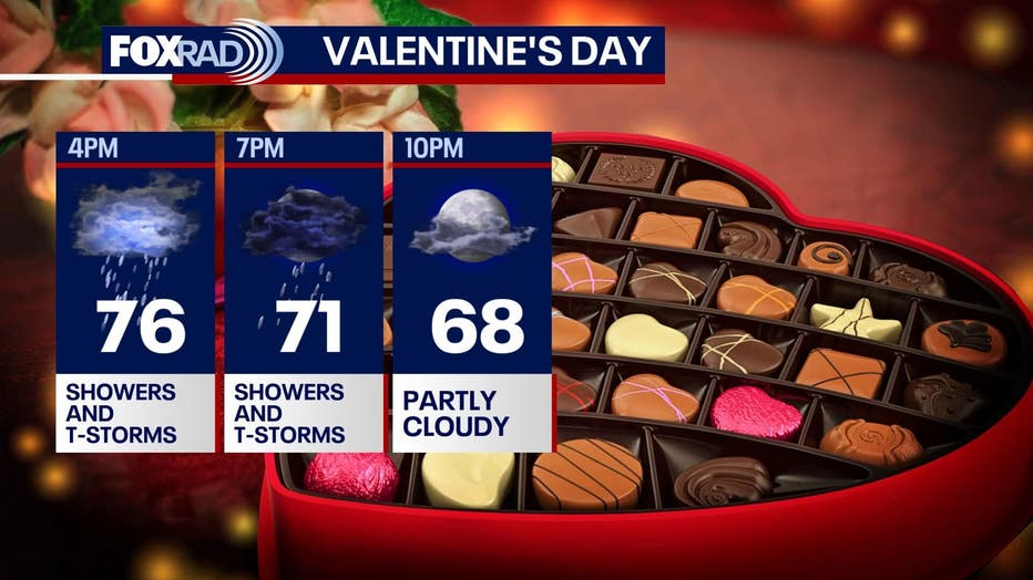 There will be a high chance of showers much of Saturday midday for Mardi Gras in Galveston and Valentine's plans. The threat of storms increases on Saturday night, between 5 p.m. to 8 p.m. for Houston and 7 p.m. to 10 p.m. in Galveston. Mardi Gras parades, concerts and parties could be impacted.
