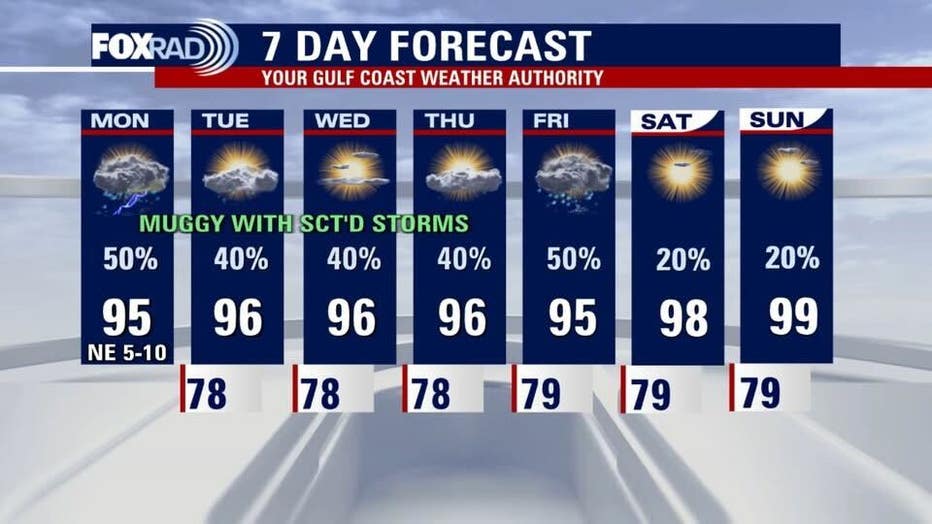 As kids head off to school this week, they'll be met with lots of humidity along with some hit-and-miss rain. A few storms could be on the hefty side, especially coming home from school. A few morning showers are also possible each morning. Away from rain, expect the temperature to feel like up to 105 degrees with actual highs in the mid 90s.