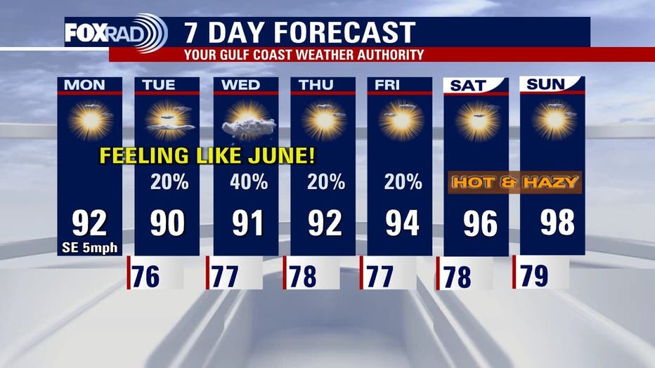 The high humidity will help the feels-like temperatures stay around 100. Look for the wind to pick up as well. A breezy 10-15 mph southeast wind will help you fight the heat if you can find some shade.