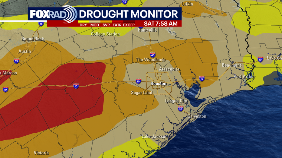 Nearly our entire viewing area is in some sort of drought risk. Widespread severe and moderate drought levels persist in Fort Bend, Harris, Liberty, Chambers, and Galveston counties among many more. Areas should get some relief in the near future — models suggest about an inch or two of rain to fall across much of the area in the next seven days.