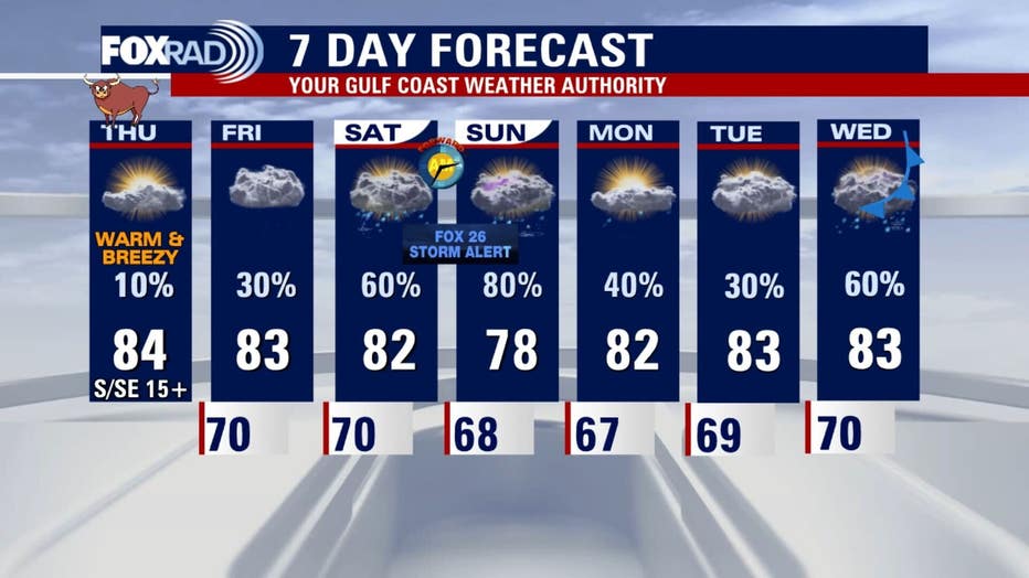 HOUSTON - Southerly flow from the Gulf keeps Southeast Texas unseasonably warm and sticky through the end of the work week. We're keeping an eye on storm chances this weekend.
