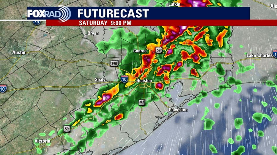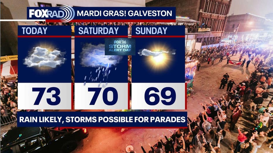 There will be a high chance of showers much of Saturday morning and Saturday afternoon for Mardi Gras in Galveston and Valentine's plans. The threat of storms increases on Saturday night, especially between 8 p.m. and midnight for Houston and 10 p.m. and 2 a.m. for Galveston.