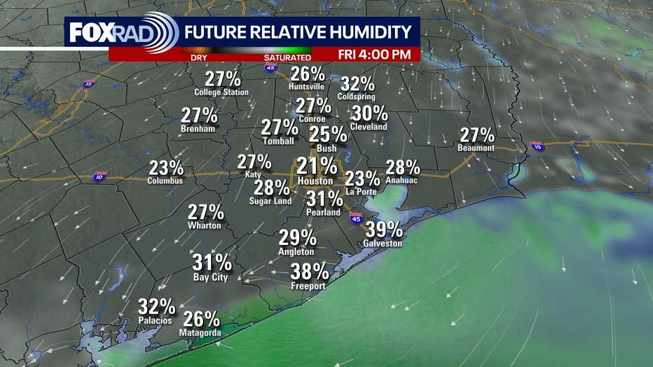 Weather in the Houston area will be sunny and dry thanks to the front that moved through on Thursday. Early mornings will dip into the 60s inland, with coastal areas staying slightly warmer. By afternoon, highs should top out near 90, but with lower humidity making things feel nice and comfortable.