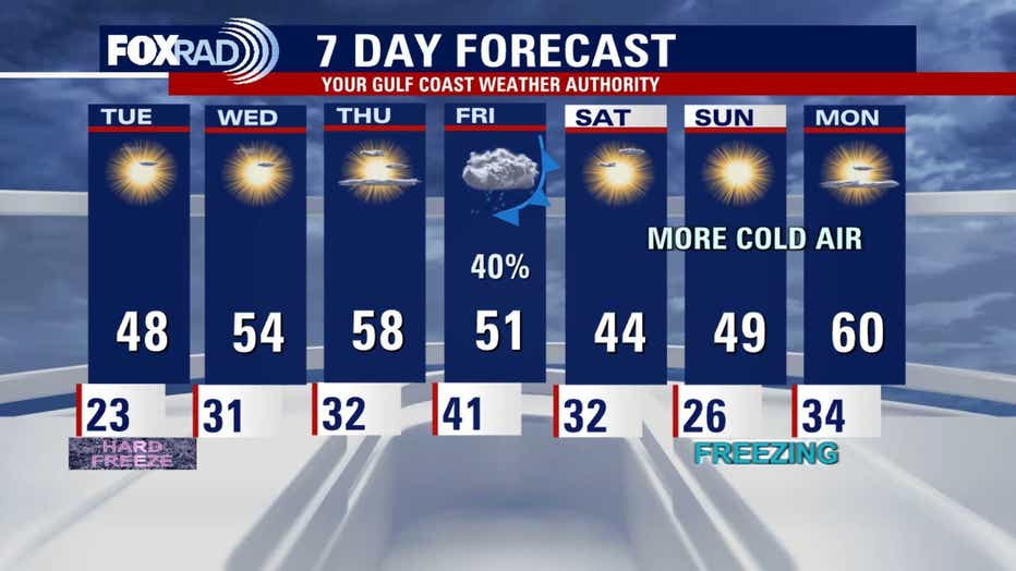 Morning temperatures were solidly below freezing, with wind chills in the teens. A few lingering icy patches remain a concern, especially across northern and western counties, but they are not a widespread problem. While sunshine should help most areas climb above freezing later today, the cold remains a threat to people, pets plants and pipes tonight as lows will plunge to the 20s again. Extreme Cold Warning remains in place for Houston and all of Southeast Texas with wind chills that could once again dip as low as 10 - 15° tonight.