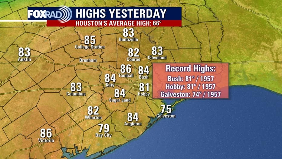 Highs on Monday and Tuesday hit the mid 80s which broke daily records from the 1950s. Record highs for today are 83 in Houston and 75 for Galveston, so we'll likely get very close.