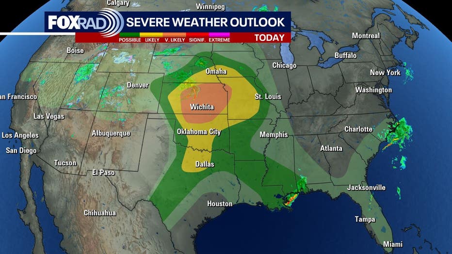 The Storm Prediction Center has the southern Plains and North Texas, cities from Omaha to Dallas in a 2/5 to 3/5 risk for tornadoes, damaging winds and up to baseball size hail. If you have family or friends who live in that area, make sure they have a way of receiving severe weather alerts as these storms will be moving in during the night.