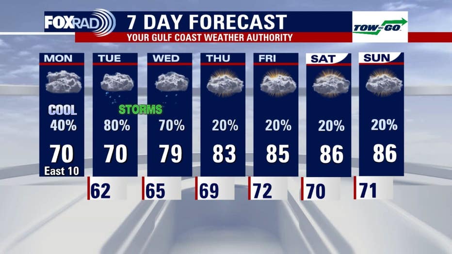 Temperatures rebound into the mid 80s by late week. Skies stay mostly cloudy with muggy temps. Rain won't go away completely, becomes more isolated.