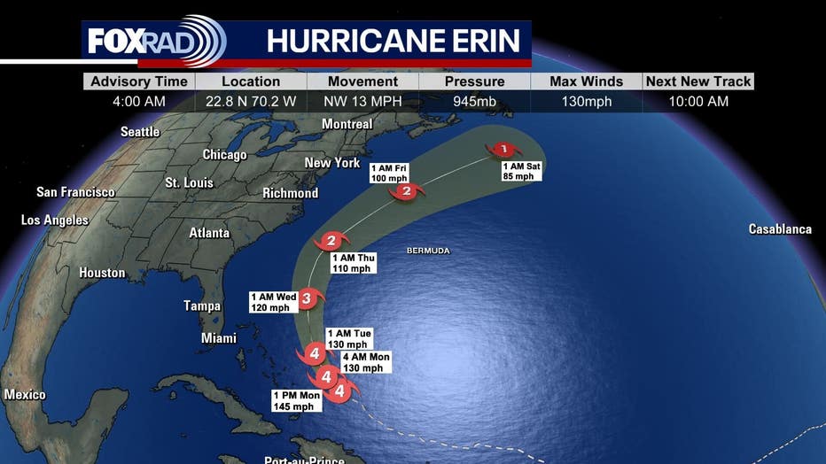 ‘Hurricane Erin’ continues to churn in the Atlantic as it passes north of Turks & Caicos and the Bahamas. The latest models have Erin curving away from the eastern coast of the U.S. this week.