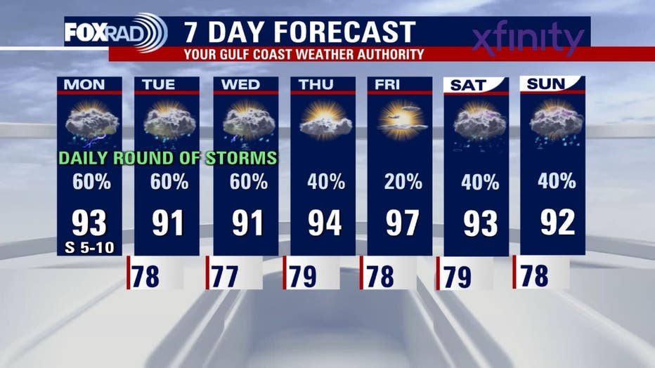 Late this week, the coverage of rain could decrease and temperatures could rise into the upper 90s before scattered storms return for the weekend.