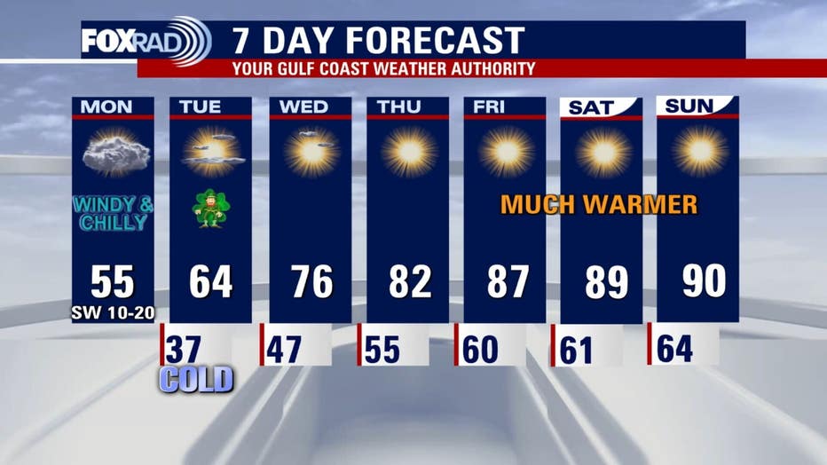 The rest of the week looks dry with calmer winds and a dramatic warm-up with upper 80s possible by the end of the week!