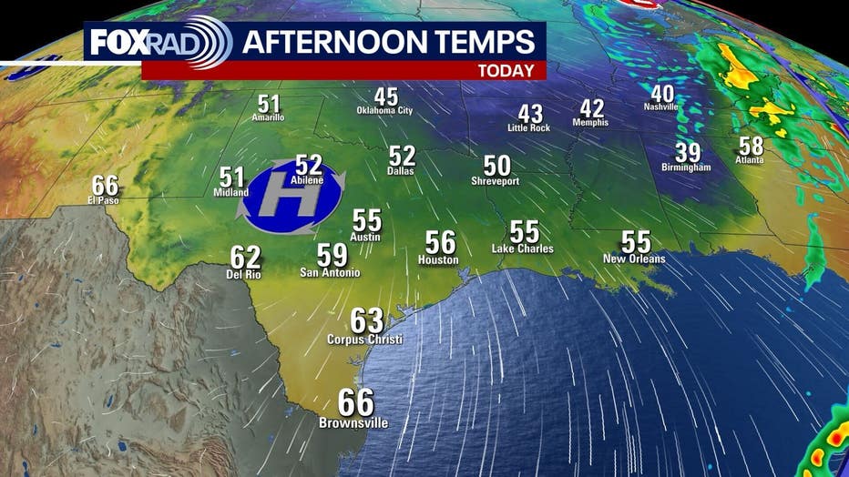 Winds gradually ease tonight and temperatures fall quickly under clear skies. Some inland spots could get close to freezing by early morning, while the Houston metro could drop into the upper 30s. We'll rebound nicely with highs in the mid 60s by the afternoon.