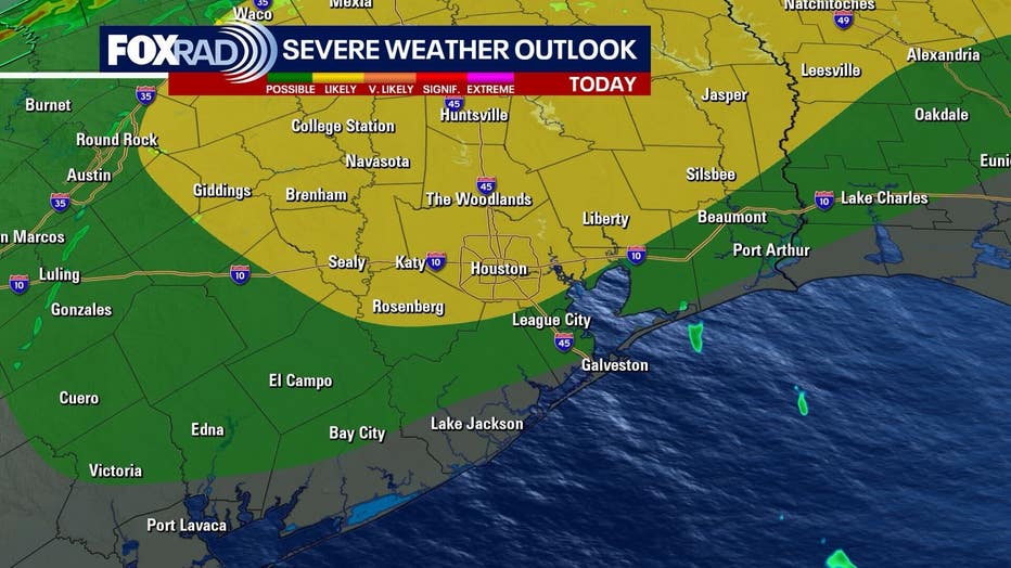 A cold front approaches today, helping spark showers and thunderstorms by mid to late afternoon. The strongest storms are expected mainly north of I-10 and west of I-45, where damaging winds, hail, and an isolated tornado are possible.