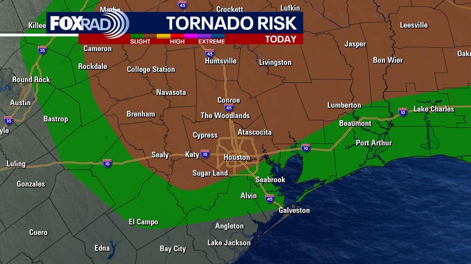 The NWS has also issued a tornado watch for several counties near the Houston-area, including Austin, Brazos, Burleson, Fort Bend, Grimes, Harris, Houston, Liberty, Madison, Montgomery, Polk, San Jacinto, Trinity, Walker, Waller, and Washington.