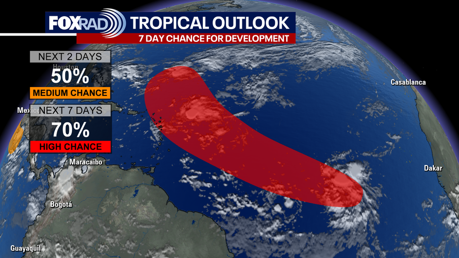 As of the recent update at 8 a.m. EDT this area has a 70% HIGH chance of development the next seven days. There will likely be a depression or tropical storm forming this week. This formation is thousands of miles away and the long-term path is uncertain. The next name on the list is Jerry.