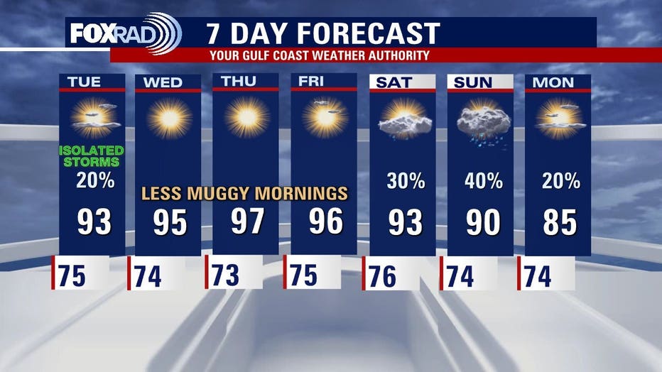 Lower atmospheric moisture along with a breeze from the west and southwest could allow our temperatures to the mid and possible upper 90s from Wednesday through Friday. For now, rain chances look very low from Wednesday through Friday and possibly lasting into Saturday.