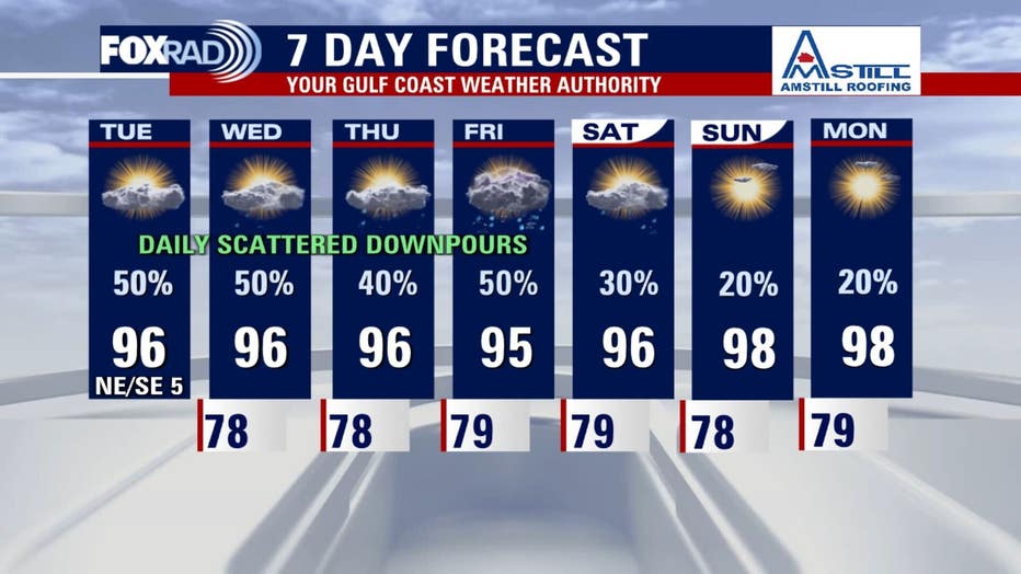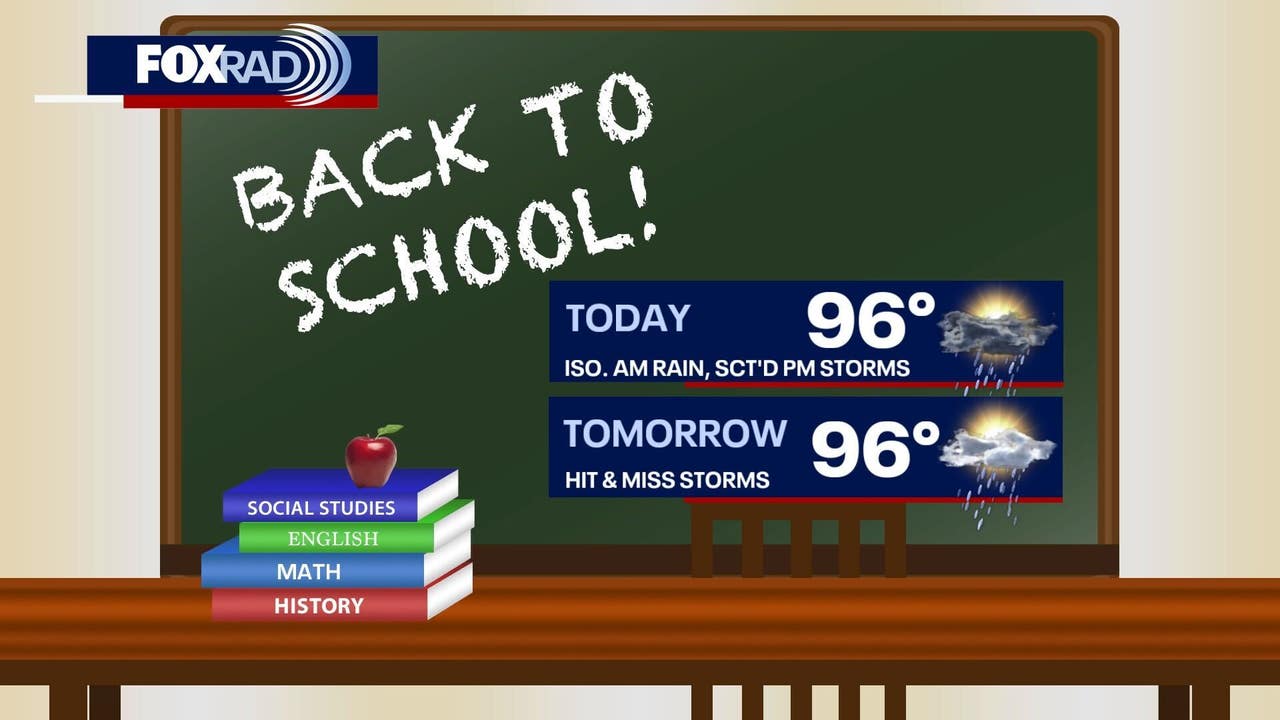Look for isolated showers Tuesday morning and scattered storms as we head into the afternoon. Summer heat is still hanging around for temperature highs to read the mid 90s.