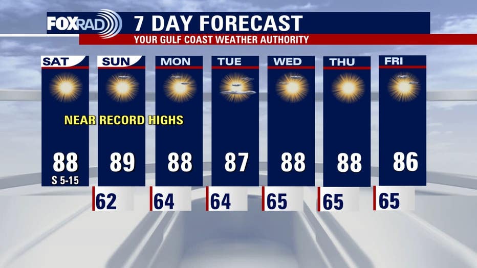 Lots of sunshine is in the forecast with a light breeze. Highs this afternoon will soar to the upper-80s and by the time you head home for the night, we remain warm in the low-70s.