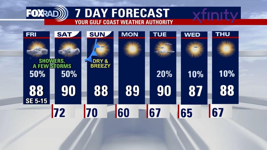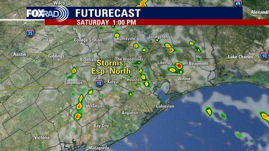 Saturday will be breezy, warm, and humid, with a 50% chance for scattered thunderstorms. A few storms could be strong, especially well north of the Houston area.