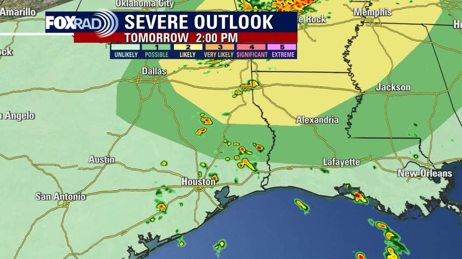 The cold front is expected to sweep through early Sunday morning. Once it clears the area, the afternoon will feature sunny skies, comfortable temperatures, but also a huge drop in humidity. Very dry air along with north breezes on Sunday mean a higher risk for fires across our area and much of Texas.